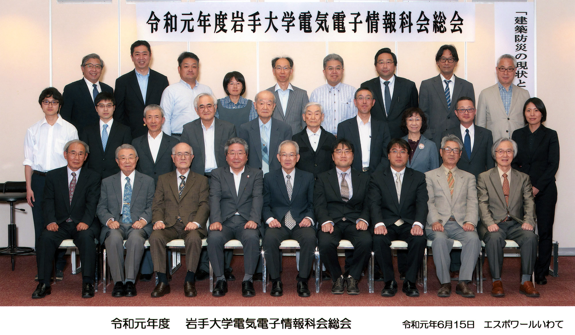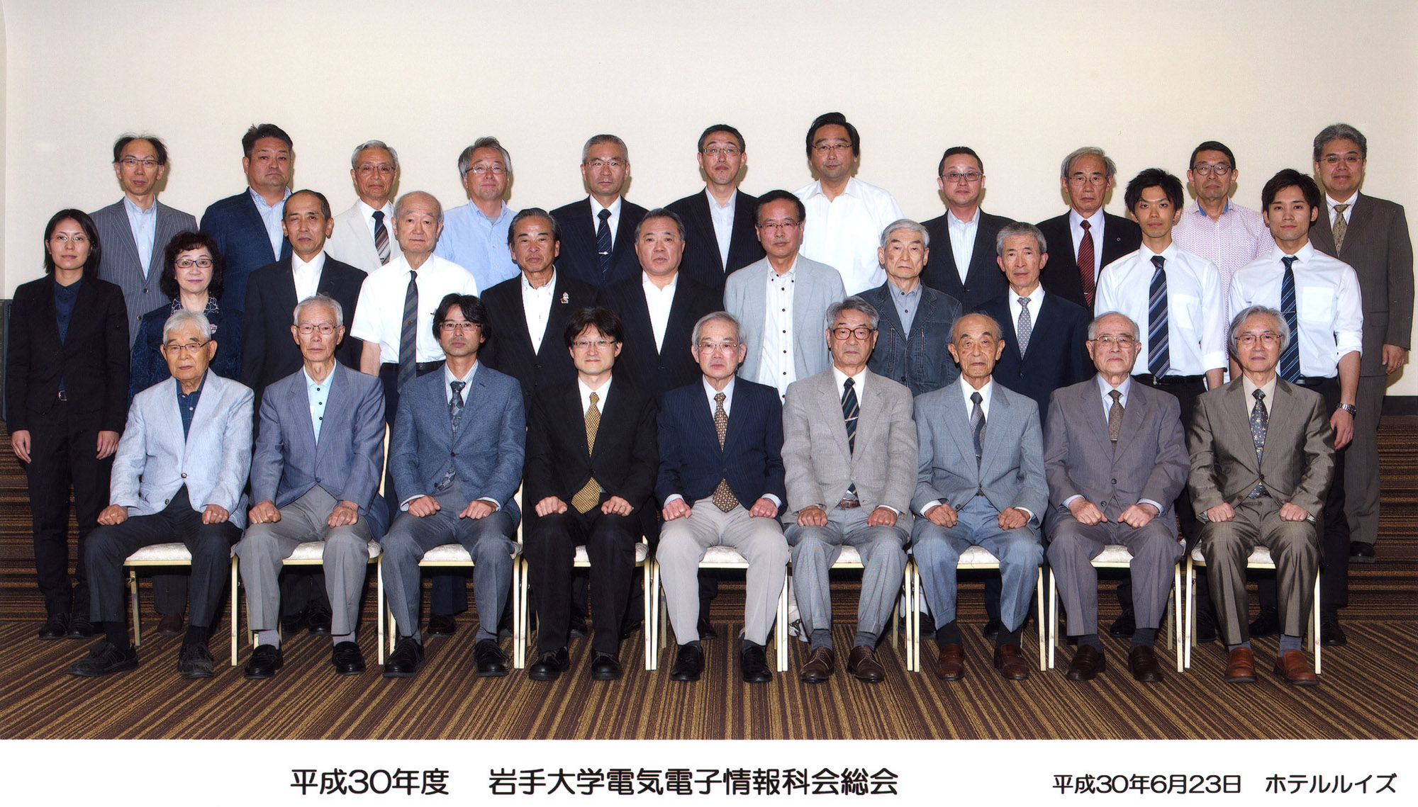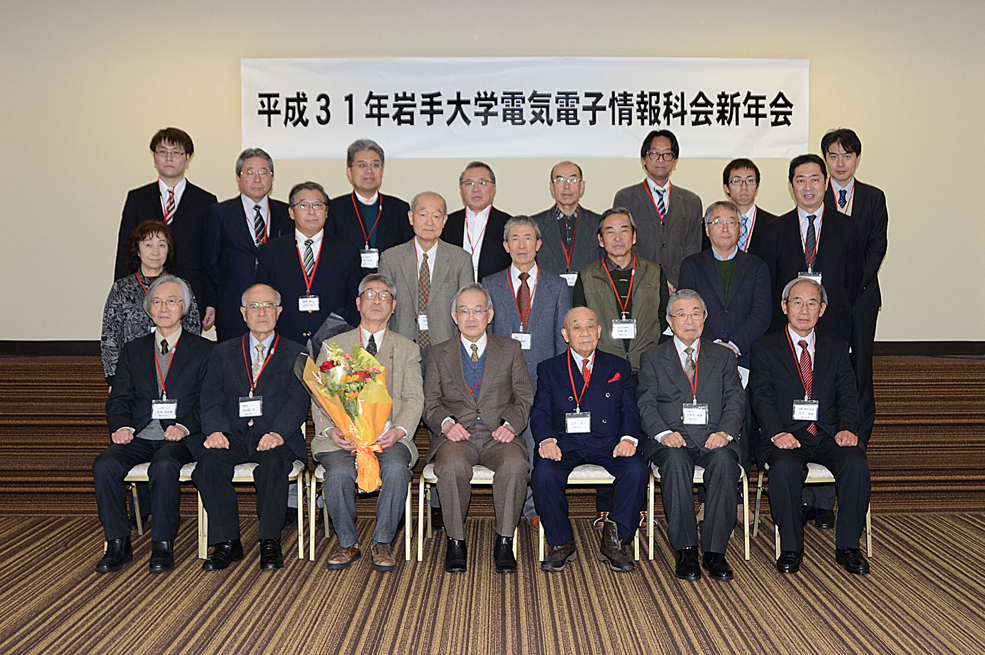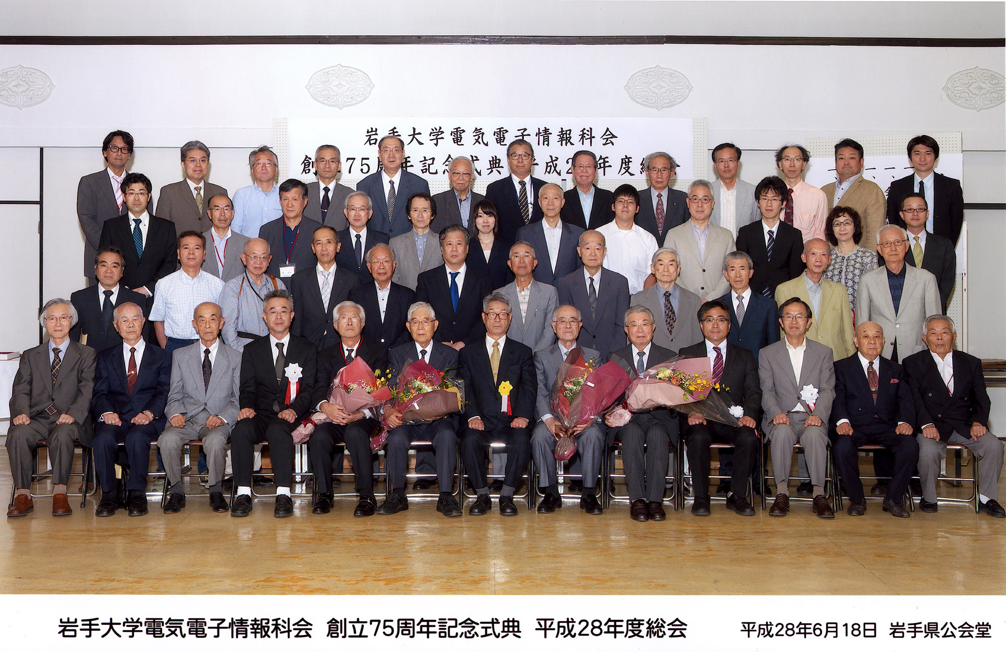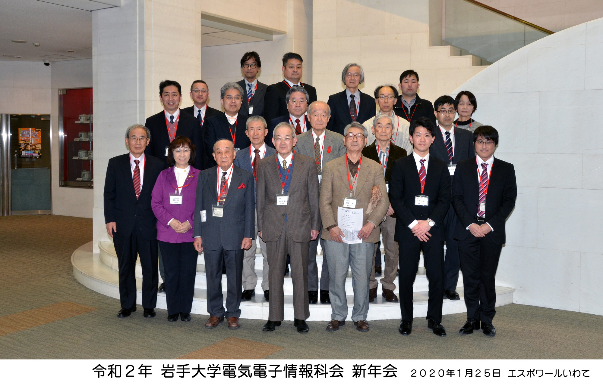 (写真をクリックすると別ウインドウで拡大画像をご覧いただけます) 盛岡支部主催の令和2年科会新年会が1月25日(土)盛岡市中央通の「エスポワールいわて」に会員22人が集まり、賑やかに歓談しました。年齢差70歳に及ぶ参加者全員から3分制限(極めて不評)のショートスピーチ。 受付を担ってくれた大学院生からは就活PR?。企業幹部世代の奮闘記、戦後間もない思い出と高齢者世代に向かう心得まで幅広いスピーチが続き、三本締めと学生歌の大合唱で締めくくりました。 令和元年11月1日(金)、紅葉がまぶしい中、盛岡市上飯岡の横河電子機器(株)盛岡事業所を見学。支部会員11人と後列は田代事業所長、伊東本社第3営業本部長と活躍している電気電子情報卒業生。 令和元年6月15日(土)、梅雨入りして小雨に煙る盛岡市大通りの「エスポワールいわて」で、令和初のの定時総会を開催。会員28名が出席しました。 平成31年1月26日(土)厳寒の中、市内のホテルに24人が参加して平成最後の盛岡支部主催「新年会」を開催しました。乾杯前に久保田会長から籏福前会長に感謝の花束を贈呈、短い時間でしたが皆さんの近況報告を聞きながら、楽しく歓談しました。 平成30年度盛岡支部の盛岡セイコー工業(株)様の見学会。 精密機械の機能美の極致に感動、岩手の「匠」の技を再認識。 (盛岡セイコー工業(株)提供) 平成30年度科会総会が6月23日に盛岡市で来賓含め31人が参加して開かれました。 平成29年4月22日、佐藤淳先生を偲ぶ会「追悼の祭儀と追悼昼食会」が盛岡市のカトリック四ツ家教会と市内のホテルで行われ、追悼昼食会での記念写真です。 <スナップ写真集に移ります> 平成28年度科会総会および科会創立75周年式典を6月18日に盛岡市で開催。4氏に草刈功労特別賞と草刈功労賞を贈呈しました。 理工学部のエントランス 理工学部玄関ロビーの故草刈遜先生の胸像 昭和40年ごろの工学部 昭和47年3月発行「30周年記念アルバム」の記念写真撮影直前にリラックスした先生方 昭和46年ごろの工学部全景 昭和46年ごろの同袍寮 昭和43年6月 電気工学科屋上から野球場と風にささやいたポプラ 昭和39年2月21日 盛岡一高屋上から。左側に工学部の木造校舎と新築工事が見える 大学を離れて郊外散歩 (岩手山が主役ですが)