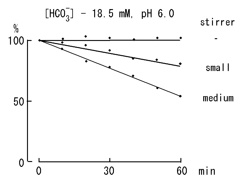 A relative decrease in concentration of HCO3- from initial value of 18.5 mM with time while rotating a stirrer. A volume of solution is 200 ml and initial pH is 6.0.