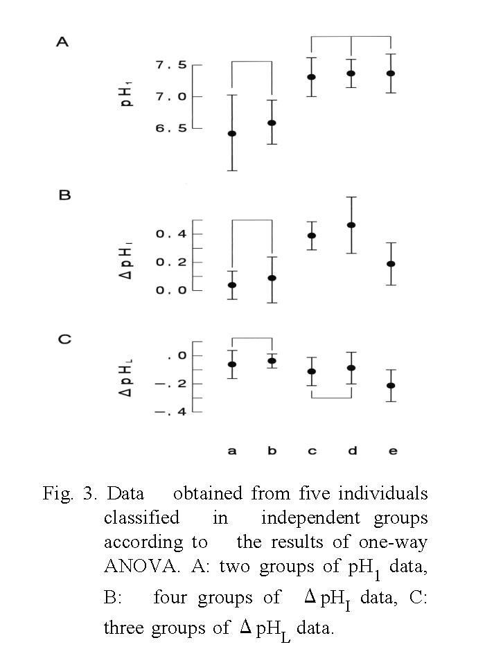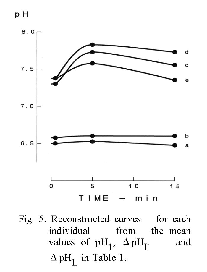 Among the three parameters of five individuals, pH1 was possible to discriminate only two groups of the a-b and the c-d-e but the curve groups reconstructed with ΔpHI and ΔpHL were distinguishable each other except the a-b group as shown number of groups in Table 2. Also, the results indicate that the difference of each individual in ΔpHI, i.e., the difference in the secretory function of HCO3-, seems to have been maintained over the 36-month period under a healthy condition.