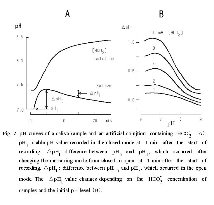 Since the size of ΔpHI depends on the concentration of HCO3- in a logarithmic manner (Fig. 2B), difference in this value of saliva reflects differences in the concentration of HCO3- in the saliva sample, if the value of pH1 is approximately constant.
