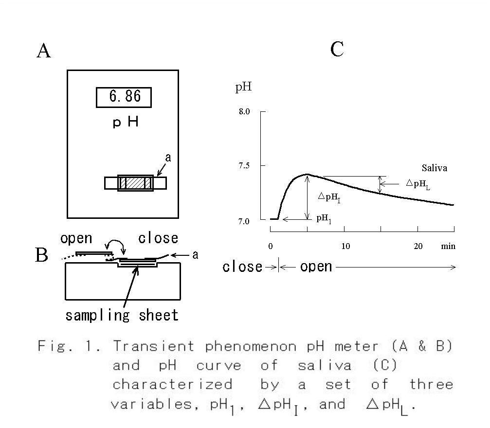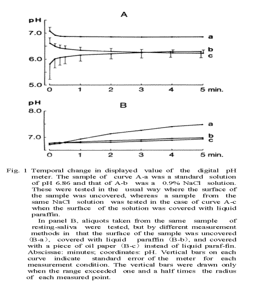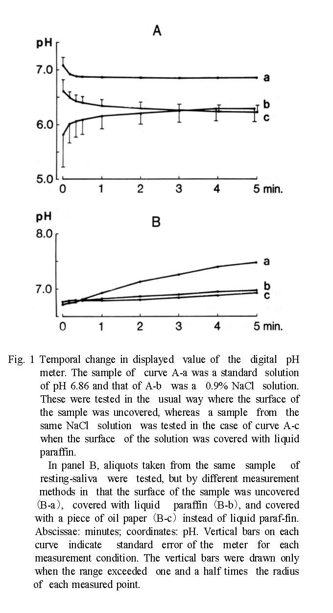 The author improved the pH meter developed by invention of Kotani and Tomita (11-12) for application to medical and dental fields which frequently handle samples containing HCO3- (13), and performed a basic research to monitor one's secretory function of the resting saliva (14). The method of measuring pH was as follows: the steady pH value of saliva sampled using a small paper slip was first recorded under blocking escape of CO2 from the surface of the sample by a plastic plate, and then change in pH with time caused by CO2 escape was recorded after removal of the plastic plate. The value of the pH change which was studied for the saliva (15-18) and the tear fluid (19-21) might provide that it is a useful index as the clinical inspection.