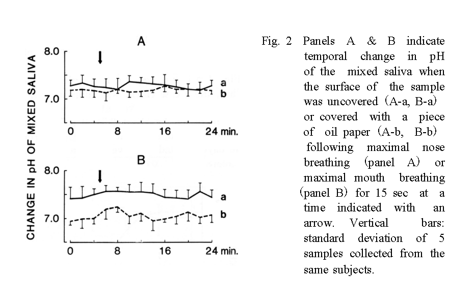 1.口腔を介して15秒間の最大努力呼吸を行った湯合に唾液 pH は呼吸終了後2〜3分間約0.2だけ上昇した。そこで口呼吸や会話による影響を避けながら以下の測定を行った。