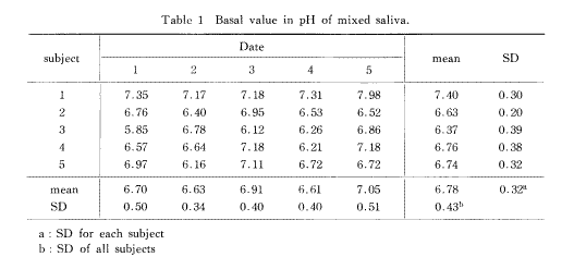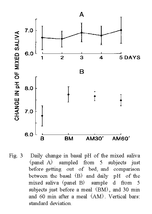 The pH's of the saliva measured before and after meals were all significantly higher than those of the basal value (p<0.01, Student's t-test), but the deviations were smaller than that