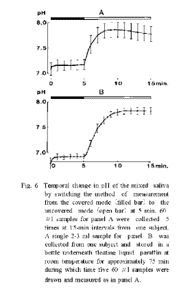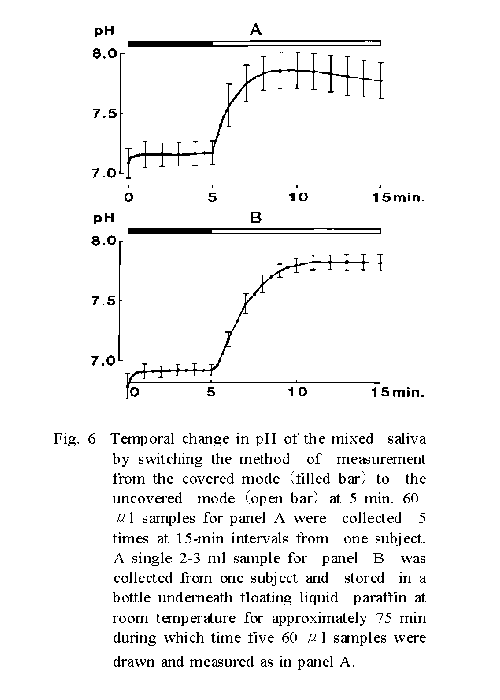 In contrast, the buffering activity of the saliva has been described as having an inverse relation between the pH of the saliva and the CO2 concentration in the alveolar airl) or CO2 binding capacity of the blood2-3). Lilienthal4) has also reported that the buffering activity of the saliva is mainly dependent on the [CO2] and [H3PO4]. Thus, it appears important to study further the pH elevation compared to the baseline in the covered mode in relation to the peak pH value measured in the uncovered mode (Fig. 6), which might be related to the CO2 loss from the sample or an decrease in the [HCO3-1 of the sample. Although further experiments are required to compare this value with the [HCO3-] change in saliva measured by direct measurement, the present method seems to have the advantage that an increase in sampling frequency is possible under clinical conditions and it is possible to trace the physiological change in the [HCO3-] of the saliva in addition to the measurement of the salivary pH.