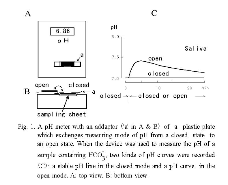 For recording of the pH curve, a pH meter equipped with a flat-type pH sensor (model C-1, Horiba, Jpn) with an adaptor with a plastic plate ('a' in Fig 1 (13)) to change the measuring mode from covered to uncovered was used. The steady pH level in the saliva (Fig. 1C, closed) was measured in the covered mode, and the change in pH with time caused by escape of CO2 was recorded after exchanging the measuring mode to the open