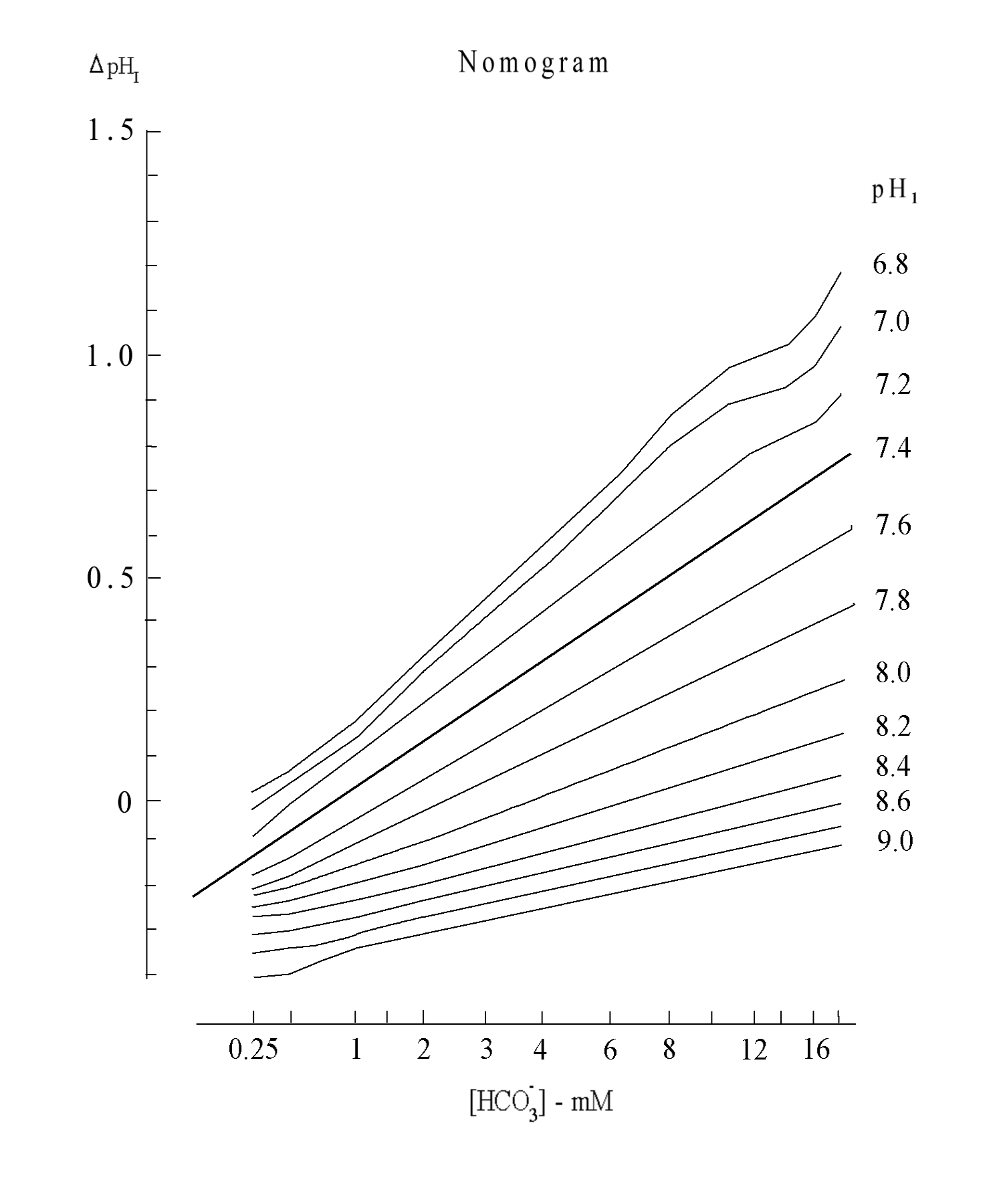 Nomogram to estimate [HCO3-] from pH1 and ΔpHI