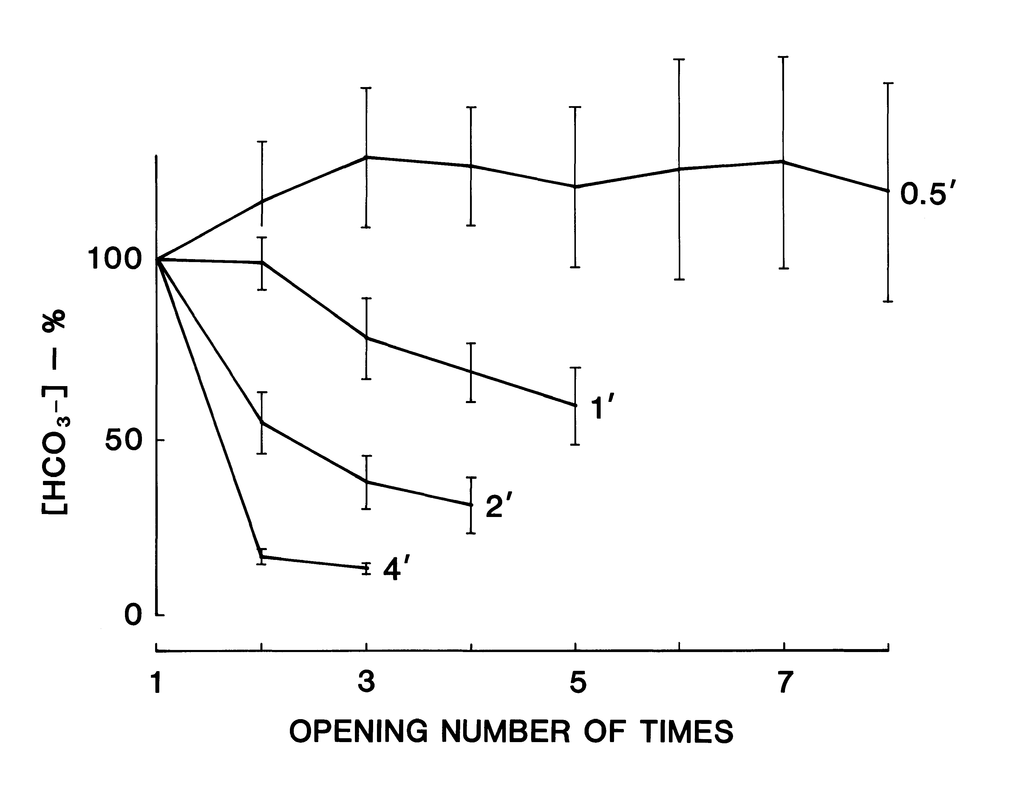 Concentration of HCO3- decreased quickly when each opening period was 4 minutes, whereas it decreased little in case the opening period awas 0.5 minutes even though a total