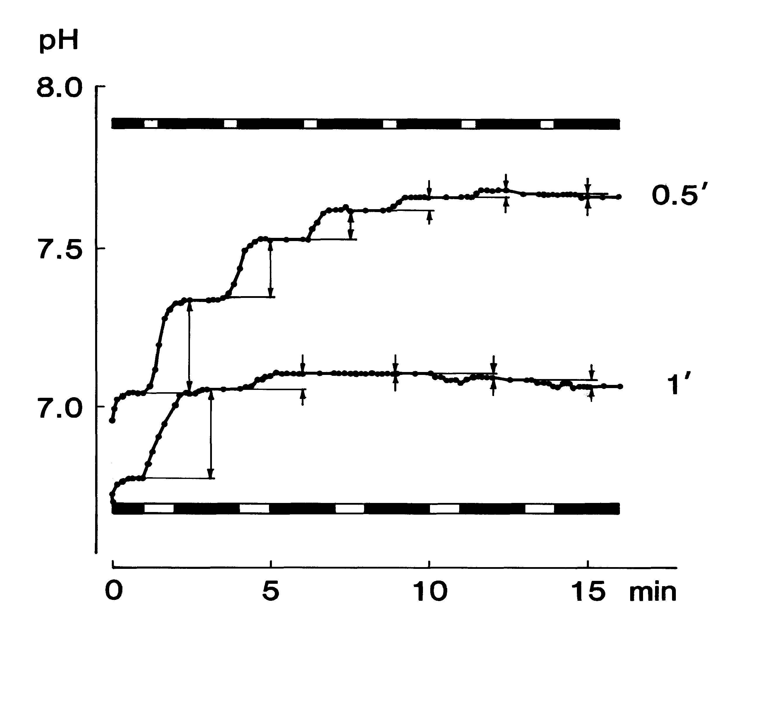Comparing salivary pH curves during repetition of open-close cycles. Dark part of horizontal bars indicate closed period of the surface of saliva sample by a plastic plate. Note upward shifts on the pH curve marked 0.5 minutes of opening period, whereas it was observed only twice at the beginning of the curve marked 1 minute. Concentration of HCO3- at each start of the opening period can be estimated by the nomogram. Results were presented on the following figure.