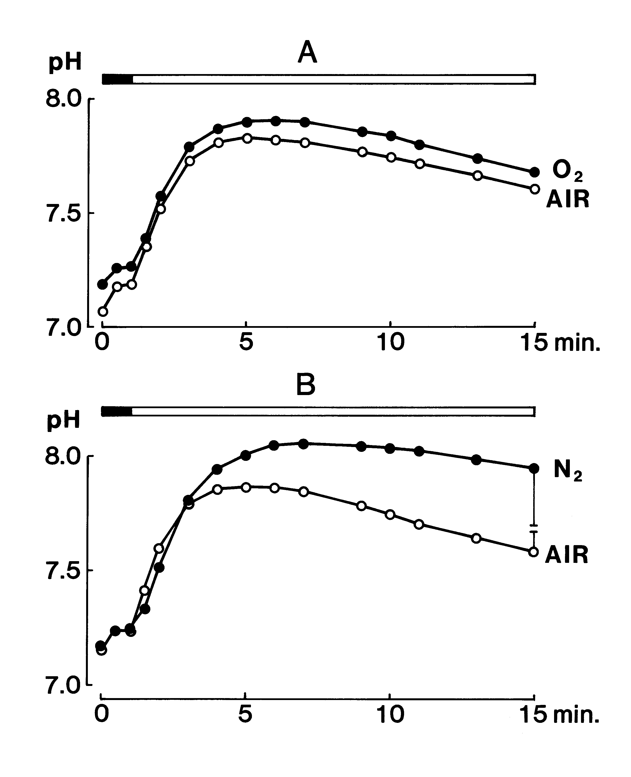NaHCO3 are shown in Fig. 2 A. The pH curve of saliva obtained under the open mode was characterized by a single peak, whereas that of the substitute solution containing HCO3- was a monotonous rise. Thus, the following three parameters, which were considered to be representative of each pH curve were measured: pH1, which was the steady pH value at 1 min after the start of measurement under the covered mode; ΔpHI, which was calculated as the difference between pH5 and pH1 after the measuring mode had been changed from covered to uncovered at 1 min; and ΔpHL, which was calculated as the difference between pH15 and pH5.