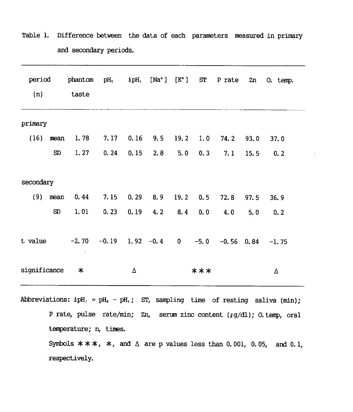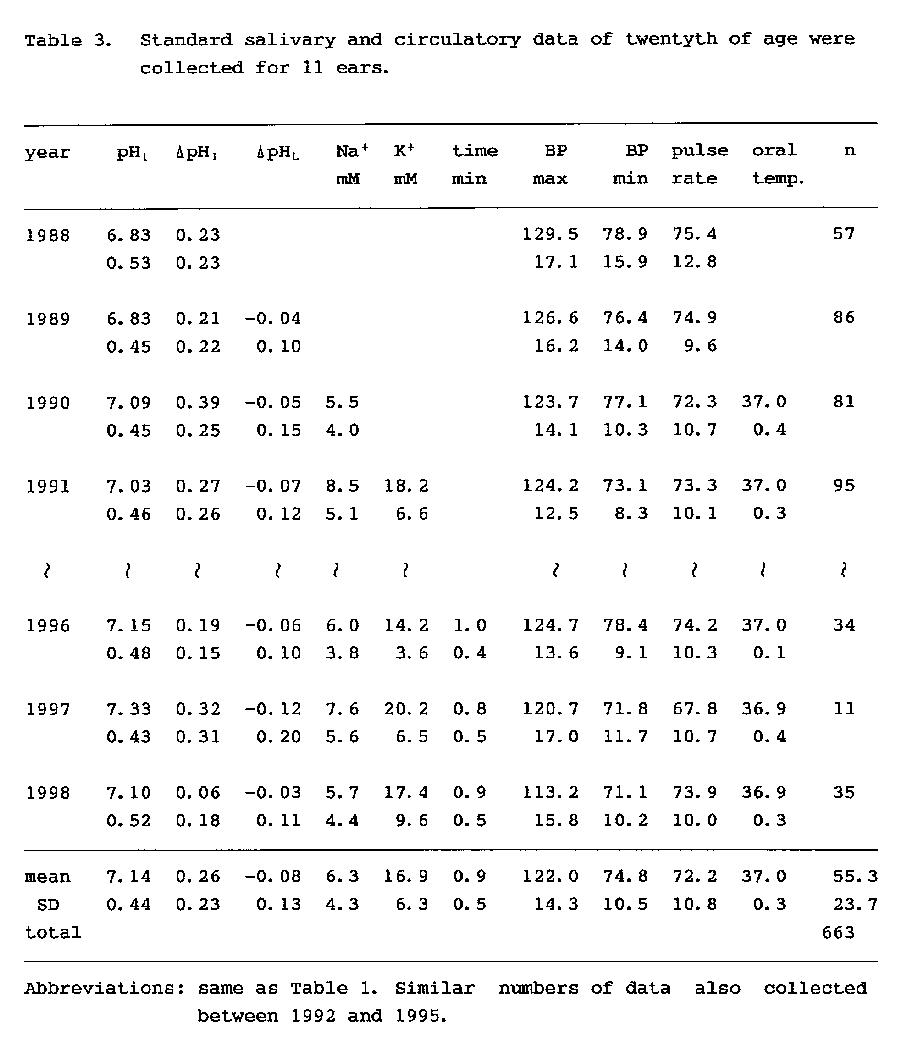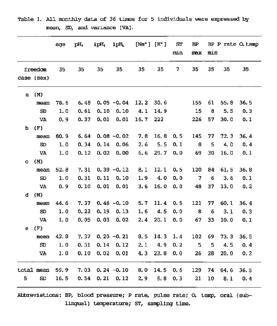 Statistical investigation by one-way ANOVA using data obtained from 5 adults over a period of 9 years (not shown in the table) showed that there were no seasonal differences in pH1, ΔpHI, blood pressure, and pulse rate but that there were seasonal differences in ΔpHL, Na+, K+ and oral temperature. The absolute values of ΔpHL, oral temperature, and Na+ concentration increased from spring to summer and then decreased from fall to winter. There were significant differences between those values recorded in summer and in winter (p<0.01). Also, the K+ concentration of saliva had a similar tendency but significance was staying in the level, which could not be denied (0.05<p<0.1).