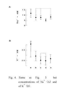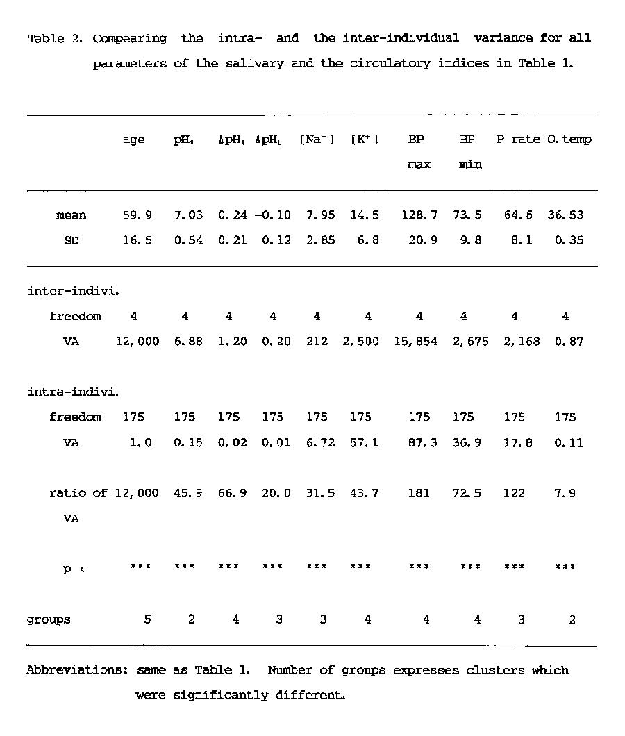 individuals was significantly (p<0.001) smaller than that of all measured values (Table 2). Since the number of groups in the table means the discriminated number of individual data as a significantly different each other, it can be said that the most discriminative salivary parameters were ΔpHI (Fig. 3) and K+ concentration (Fig. 4) same as blood pressure, and that the lowest salivary parameter was pH1 same as oral temperature (Table 2). The median discriminative salivary parameters were ΔpHL and Na+ concentration, same as pulse rate.