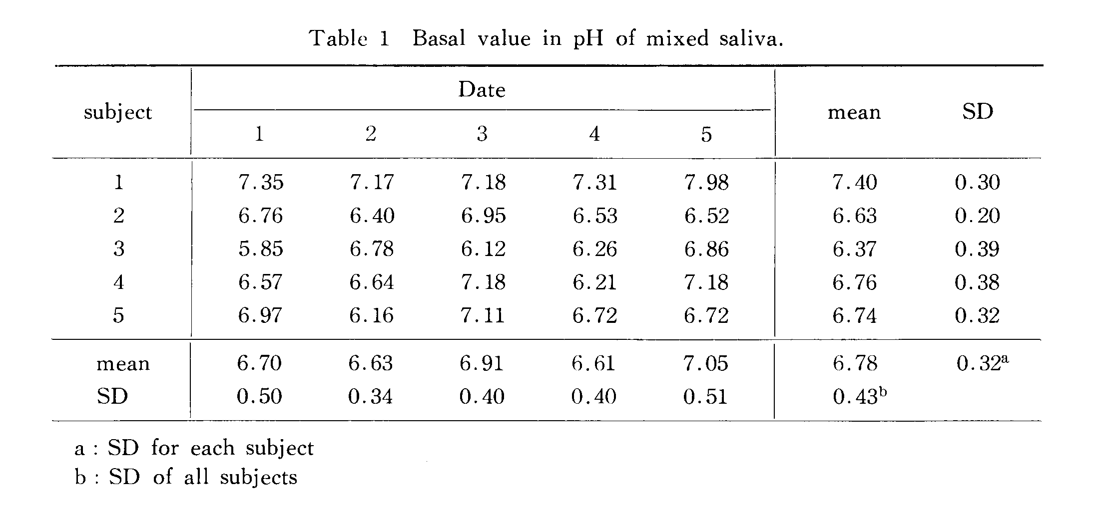 Without the pH elevation caused by mouth breathing or vigorous conversation, the samples of resting-saliva which were collected from 5 subjects in the morning just before rising from bed (basal pH value) were analyzed for 5 days. The mean pH value fluctuated little in comparison with the range of the standard deviation (Fig. 3A). The standard deviation of the daily data for each person was 27 % smaller than that of all subjects (Table