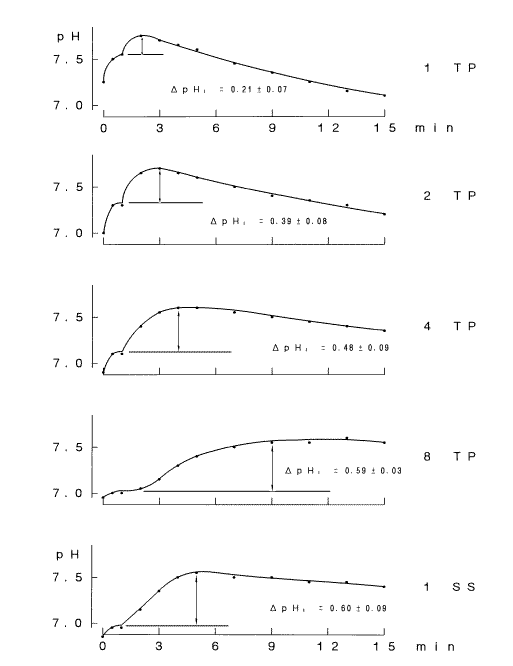 The pH1 is the steady pH value of saliva that is measured at 1 min from the start of recording under the condition in which escape of CO2 from the sample is blocked by a plastic plate. Although the steady value of pH is obtainable after 30 seconds from the start of recording (Fig. 1C), it shows a gradual shift towards alkalinization in several minutes if the initial concentration of NaHCO3 is high, as it is in the lacrima (19).